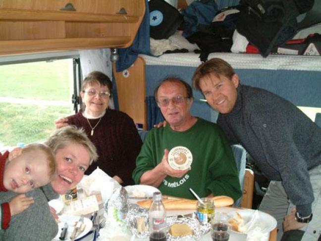 Når den første nytelsen med å velge ut og handle og få det hele i hus er overstått, er det blitt tid for å nyte de gode varene. Etter min smak skal man legge alle de gode varene på bordet og så ellers bare nippe seg gjennom og smake på de forskjellige tingene. Skulle vi ha spist på fransk maner, skulle kjøtt, ost med mer ha vært servert hver for seg – rett etter rett. Våre franske venner Christian og Mathé, som besøker oss i bobilen, er begeistret for den fransk-danske blanding av god mat og dansk hygge. Vi sitter mange timer ved bordet. Det er to år siden vi sist så hverandre, så det er nok å snakke om. Og vi går heller ikke sultne fra bordet. På gjensyn i morgen Mathias, Rasmus og Anne-Vibeke NB: Det er forøvrig suverent god plass midt i bobilen til fire voksne og et barn. Det er fire sitteplasser ved bordet, men det kan trekkes ut slik at sofaen ovenfor også kan tas i bruk.
