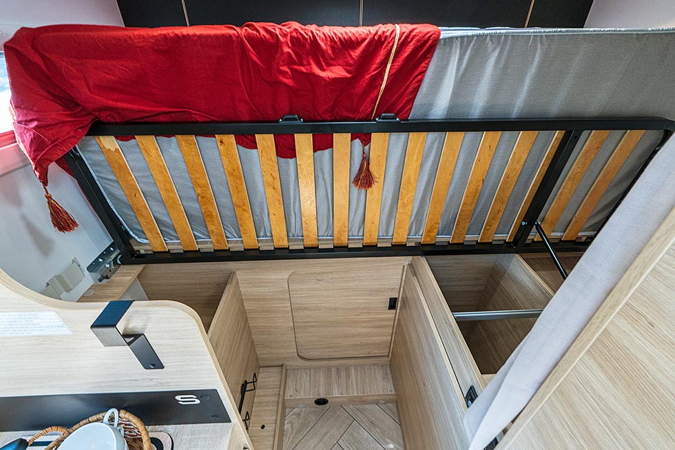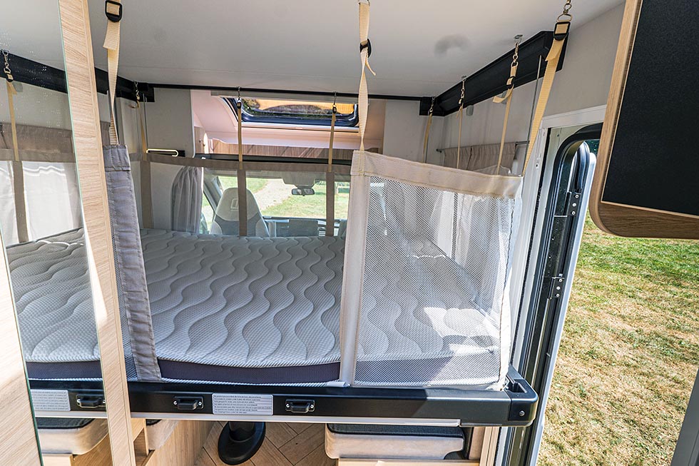 Den todelte sengen er en lur løsning. Man kan vippe opp den bakre halvdelen for å få et garasjevolum i full høyde. Man kan også løfte den fremre halvdelen for å komme til garderobene og inn i garasjen. Challenger kaller sengeløsningen «Butterfly» – et overraskende passende navn, da sengedelene kan minne om sommerfuglvinger.